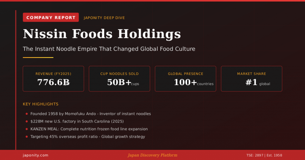 Nissin Foods Holdings Co., Ltd. (TSE: 2897) is the world’s largest instant noodle company and the inventor of an entire food category. Founded by Momofuku Ando in 1958, the company has grown from a backyard shed in Osaka to a global empire with operations in over 100 countries, consolidated revenue of 776.6 billion yen (approx. $5.2B) in FY2025, and a dominant 15% share of the global instant noodle market.